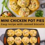 These Mini Chicken Pot Pies are everything you love about classic chicken pot pie, warm, creamy, and comforting but baked up into perfectly portioned little cups that fit right in your hand. Made with canned biscuits, a creamy chicken and vegetable filling, and baked in a muffin pan. They're an easy shortcut supper you'll want to keep on repeat!