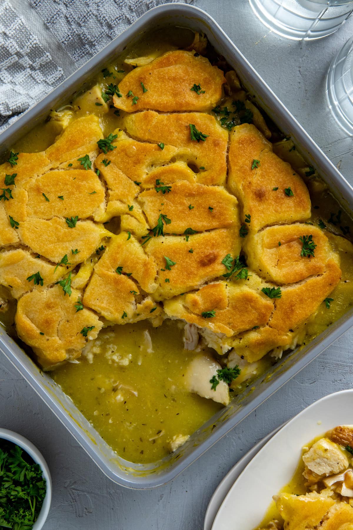 This is a poured-crust cobbler, so the batter is meant to bake over the filling, not under it. As it cooks, the batter rises and sets into a soft, golden crust while the creamy chicken stays underneath. It may look odd going in, but it works!