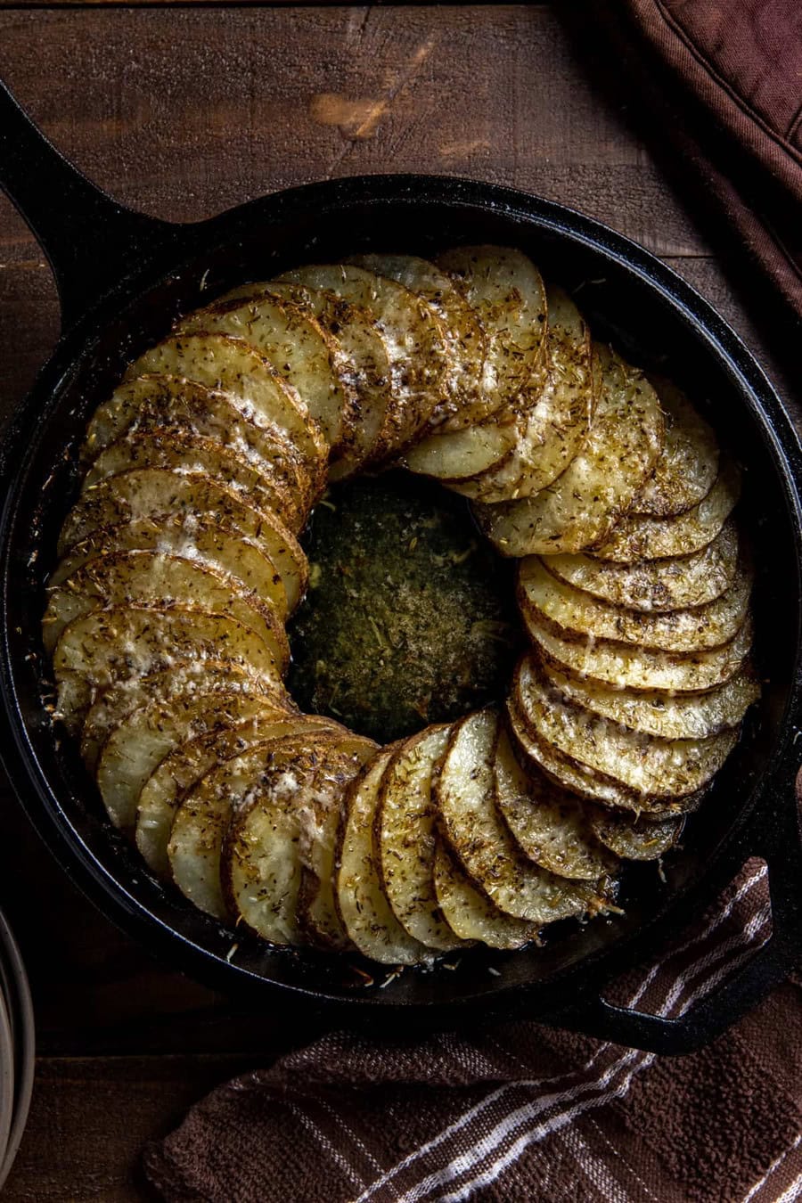 It doesn't get much easier than Cast Iron Skillet Potato Slices! A simple, classic potato side dish recipe that you and your family will love. Simply slice the potatoes, pour melted butter on top, add some herbs and parmesan cheese. Bake until hot and creamy.