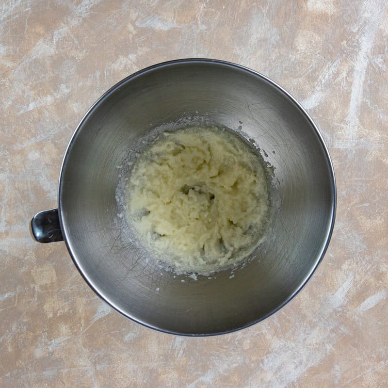 - Blend the sugar and butter in a large bowl with an electric mixer. Blend on medium speed for about 1 minute.
