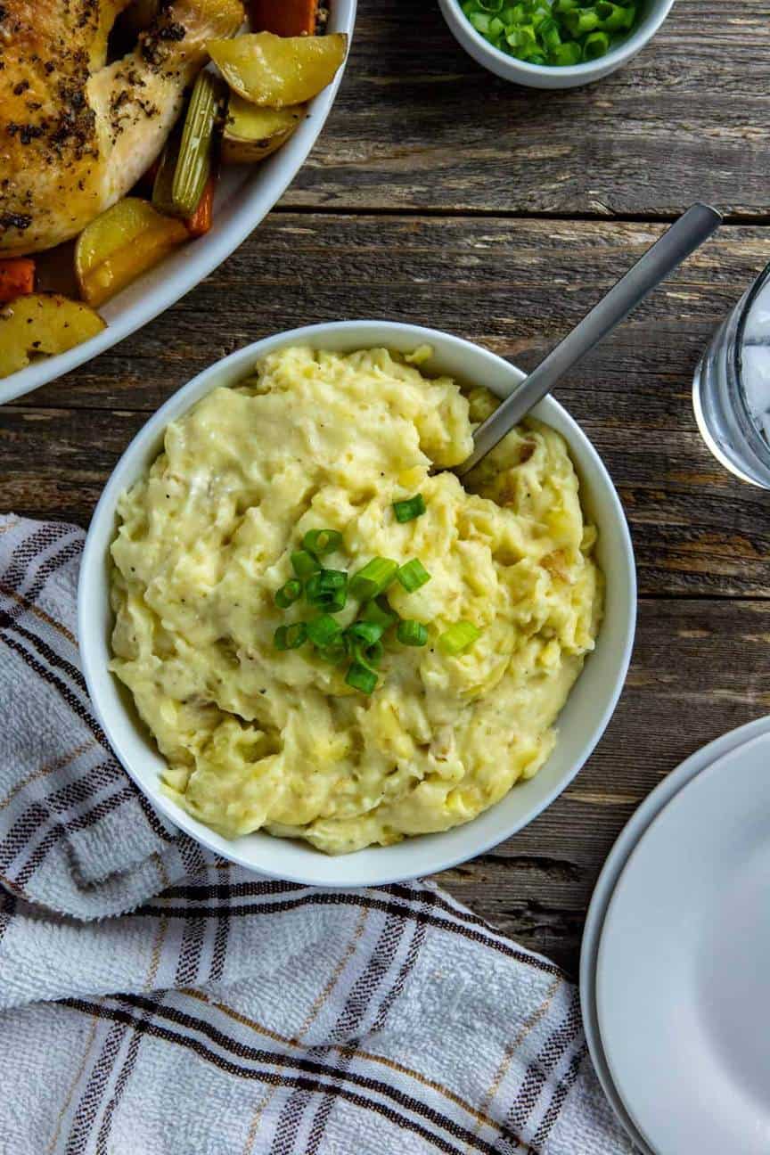 - Place the mashed potatoes in a nice serving bowl, top with sliced green onions, and serve immediately.